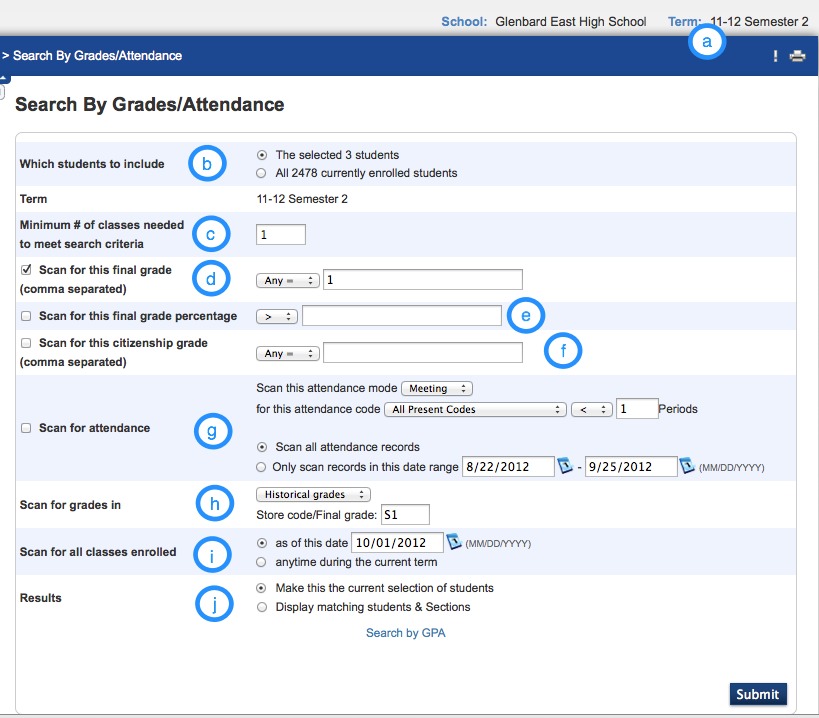 Scan for this final grade percentage | e-Fifth heading on the page | This option allows you to search for students with specific stored grade percentages. To use this search option, first check its checkbox.