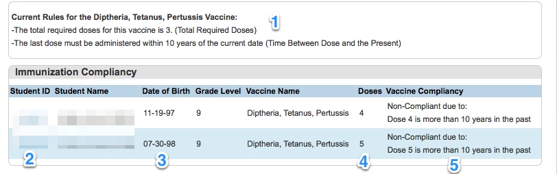 Nursing staff can run a report to determine which students are compliant or are not compliant for particular vaccines.