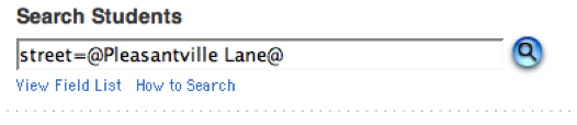 The search results will be a list of students that live at 111 Pleasantville Lane, 123 Pleasantville Lane, 555 Pleasantville Lane, etc. It looks like we have gotten all the students that live on Pleasantville Lane, but what about the apartments? 987 Pleasantville Lane Apt 3B is not on this list. What happened? PowerSchool will only do what we tell. We asked for any address that ended in Pleasantville Lane. 987 Pleasantville Lane Apt 3B ends in “Apt 3B” so this student is not listed. No problem, we use two wildcards, one at the beginning and one at the end of the last name. Our new search is “street=@Pleasantville Lane@”.