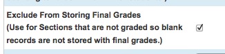 - About half way down the Edit Section page is a check box titled Exclude from Storing Final Grades. Click this check box.